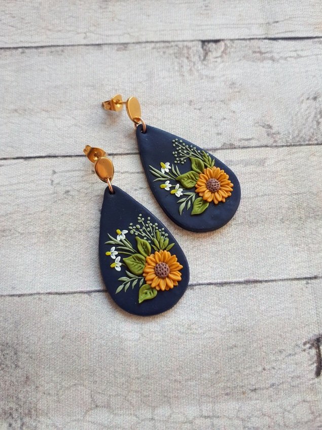 Pendientes colgantes de girasol con forma de lágrima de arcilla polimérica.